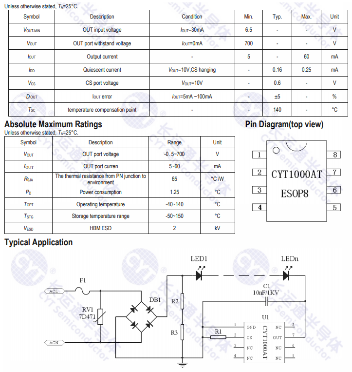 CYT1000AT is a linear constant current IC with adjustable output current, high constant current precision, simple application scheme, few peripheral components in the system structure, over-temperatur...