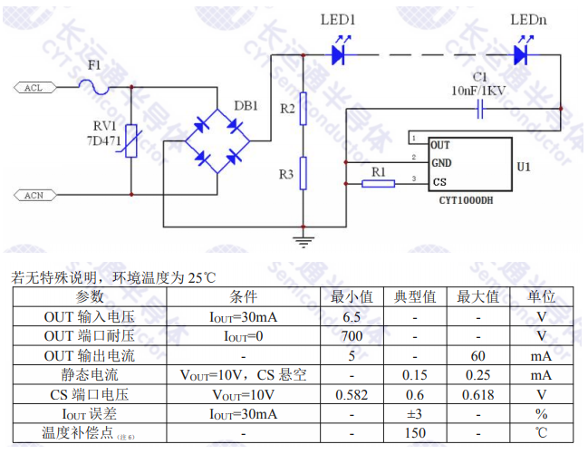 CYT1000DH is a Single Channel high voltage linear constant current LED driver, which integrates 700V high voltage MOS. The output current can be set through an external resistor between 5mA and 60mA.C...