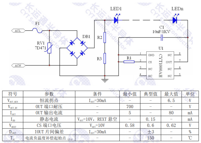 CYT1000AH is a Single Channel high voltage linear constant current LED driver, which integrates 700V high voltage MOS. The output current can be set through an external resistor between 5mA and 80mA.