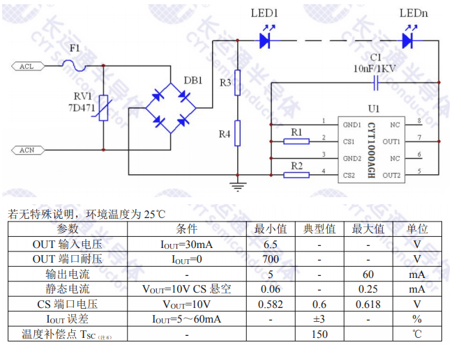 CYT1000AGH is a dual channel high voltage linear constant current LED driver, which integrates 700V high voltage MOS. The output current can be set through an external resistor between 5mA and 60mA.