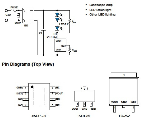 ICL1104 is a single channel high voltage linear constant current LED driver, which integrates 8DOV high voltage MOS. The output current can be set through an external resistor between 5mA and 80mA. ICL1104 built-in linear type thermal protection function to effectively prevent damage to the system caused by high temperature. ICL1104 system has simple peripherals, flexible application, high reliability, small volume, low system BOM cost, adjustable packaging technology can be applied to all kinds of LED lamps.