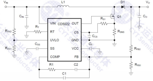 CD5022 國產PWM控制驅動器 完美替代TI/LM5022,是一款適用于Boost和SEPIC穩壓器的高壓、低側、N溝道MOSFET控制器。該器件包含實施單端主要拓撲所需的全部特性。輸出電壓調節基于電流模式控制,這不僅簡化了環路補償的設計,同時還能夠提供固有輸入電壓前饋。包含一個啟動穩壓器,該穩壓器能夠在6V至60V的寬輸入范圍內工作。PWM控制器專為高速性能而設計,包含一個振蕩器,振蕩器頻率范圍高達2.2MHz,總傳播延遲低于100ns。其它功能還包括誤差放大器、精密基準、線路欠壓鎖定、逐周期電流限制、斜率補償、軟啟動、外部同步功能和熱關斷。6V至60V寬輸入電壓、電流模式升壓、SEPIC 和反激式控制器;適用于Boost和SEPIC穩壓器的高壓、低側、N溝道MOSFET控制器,該器件包含實施單端主要拓撲所需的全部特性。