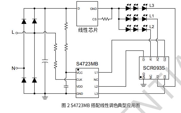 S4723MB是帶狀態記憶功能的開關調光調色控制器,有三個控制端口,可以通過調節恒流主控的限流電阻實現三段帶記憶開關調光,也可以搭配線性主控控制三路光源實現三路帶記憶開關調色。芯片內部設定狀態切換窗口時間Tsw(典型值3.2S),關燈時間超過狀態切換窗口時間芯片會記住關燈前的狀態,下次開燈時直接呈現關燈前的狀態;關燈時間小于狀態切換窗口時間開燈可以實現狀態調節,增加了使用的便利性。 S4723MB通過檢測AC信號來判斷輸入開關的動作,并根據檢測結果對三個控制端口進行開關切換。三個控制端口可以驅動MOS管和晶閘管(線性調色方案可以搭配我司內置三路晶閘管的SCR093S實現低成本解決方案)。