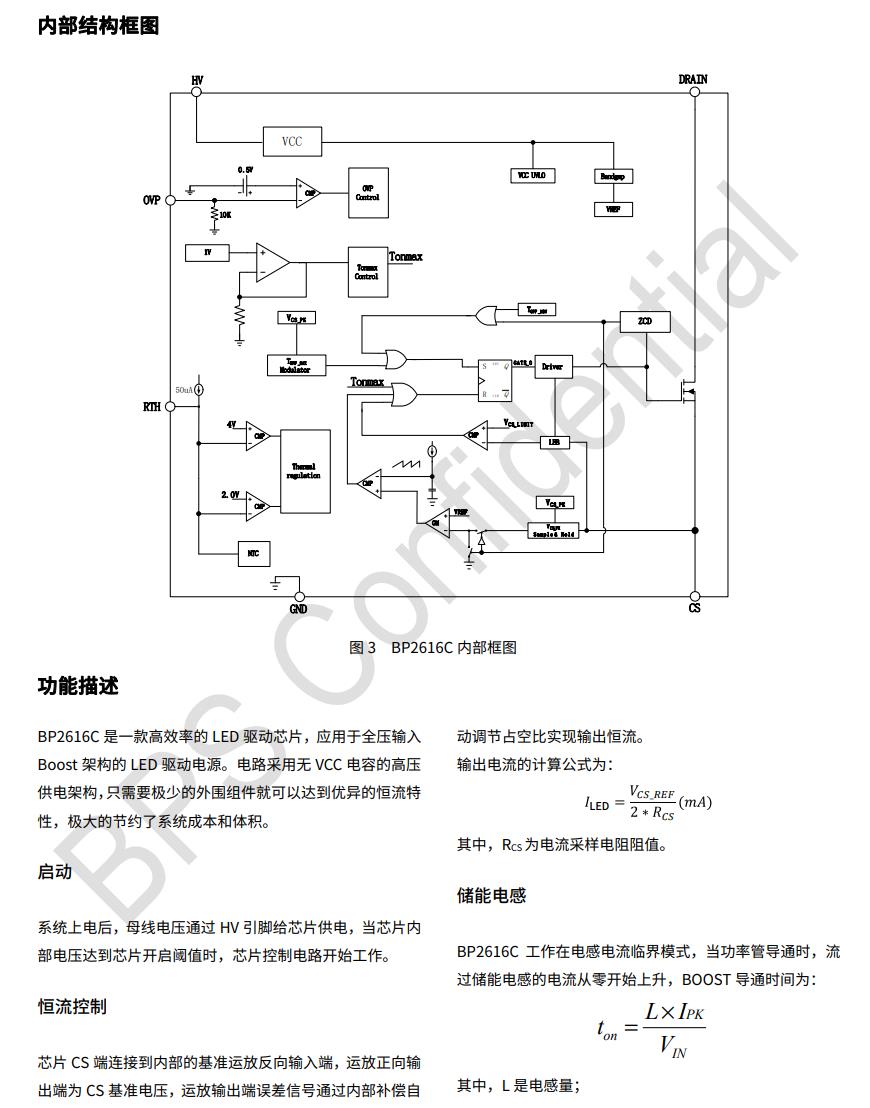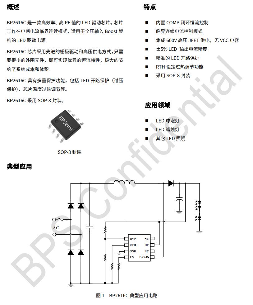 BP2616是一款高效率、高PF值的LED驅動芯片。芯片工作在電感電流臨界連續模式,適用于全壓輸入Boost架構的LED驅動電源。BP2616芯片采用先進的柵極驅動和高壓供電方式,只需要很少的外圍元件,即可實現優異的恒流特性,極大的節約了系統成本和體積。BP2616具有多重保護功能,包括LED開路保護(過壓保護)、芯片溫度過熱調節等。BP2616采用SOP-8封裝。