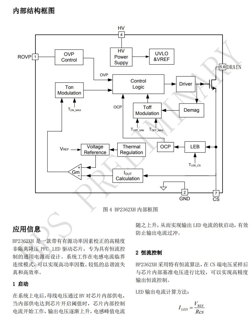 BP2362XH去除了VCC,COMP電容以此簡化外部電路。 它采用了特有的電流檢測技術,減少了外部元件的 同時可實現高精度輸出電流,且擁有良好的線性調 整率和負載調整率。
