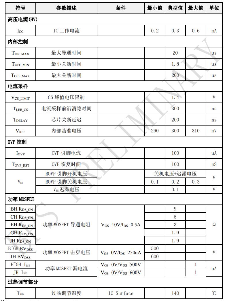 產品型號 | 封裝 | 無VCC 無COMP | MOS內阻 | MOS耐壓 | 開路保護 | 內置CS電阻 | 內置 續流二極管 | 內置橋堆 | 輸出電流@Vout=72V(mA) (Vin=176V-265V) |