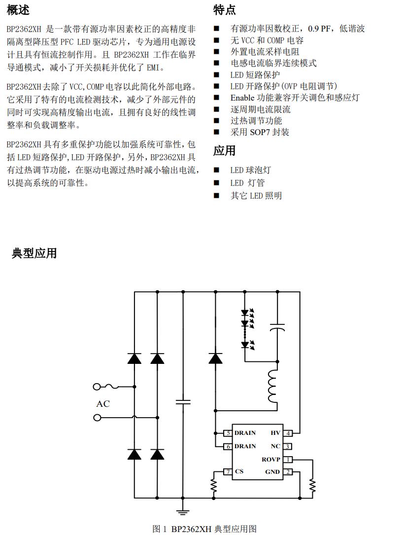 BP2362XH 是一款帶有源功率因素校正的高精度非 隔離型降壓型 PFC LED 驅動芯片,專為通用電源設 計且具有恒流控制作用。且 BP2362XH 工作在臨界 導通模式,減小了開關損耗并優化了 EMI。