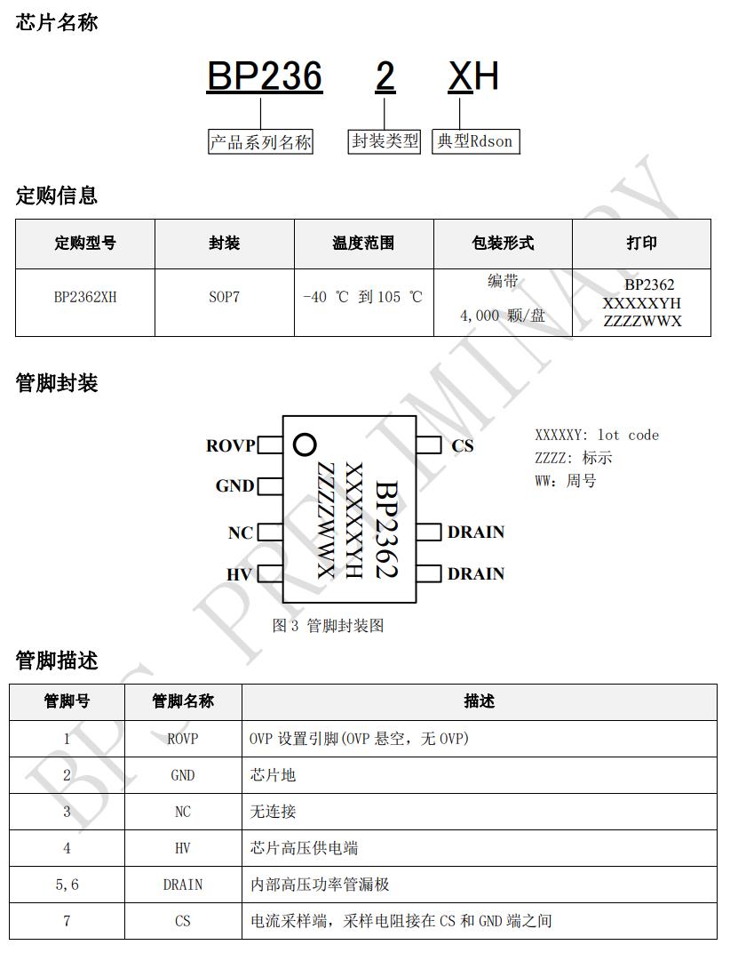 BP2362JH | SOP7 | Y | 1.9Ω | 600V | External | Y | - | - | <270 |