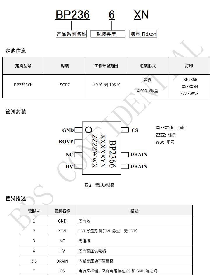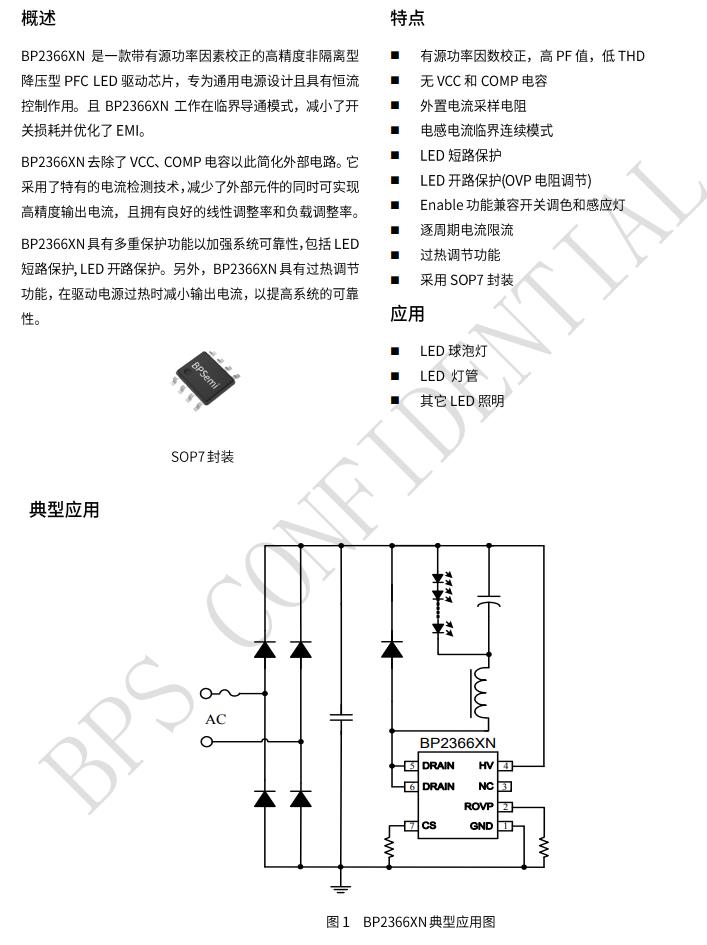 BP2366XN是一款帶有源功率因素校正的高精度非隔離型 降壓型PFCLED驅(qū)動(dòng)芯片,專為通用電源設(shè)計(jì)且具有恒流控制作用。且BP2366XN工作在臨界導(dǎo)通模式,減小了開關(guān)損耗并優(yōu)化了EMI。