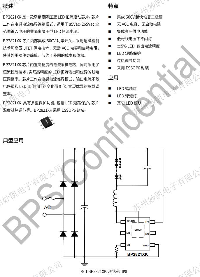 BP2821XK芯片內置高精度的電流采樣電路,同時采用了恒流控制技術,實現高精度的LED恒流輸出和優異的線電壓調整率。芯片工作在電感電流臨界模式,輸出電流不隨電感量和LED工作電壓的變化而變化,實現優異的負載調整率。BP2821XK具有多重保護功能,包括LED短路保護,芯片溫度過熱調節等。BP2821XK采用ESSOP6封裝。