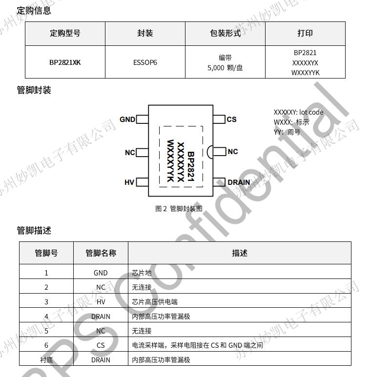集成600V超快恢復二極管無VCC電容、無啟動電阻集成高壓供電功能低母線電壓下不閃燈土5%LED輸出電流精度LED短路保護過熱調節功能采用ESSOP6封裝