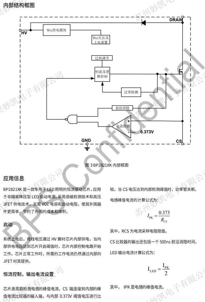 BP2821XK是一款高精度降壓型LED恒流驅動芯片。芯片工作在電感電流臨界連續模式,適用于85Vac~265Vac全范圍輸入電壓的非隔離降壓型LED恒流電源。BP2821XK芯片內部集成500V功率開關,采用退磁檢測技術和高壓JFET供電技術,無需VCC電容和啟動電阻,使其外圍器件更簡單,節約了外圍的成本和體積。