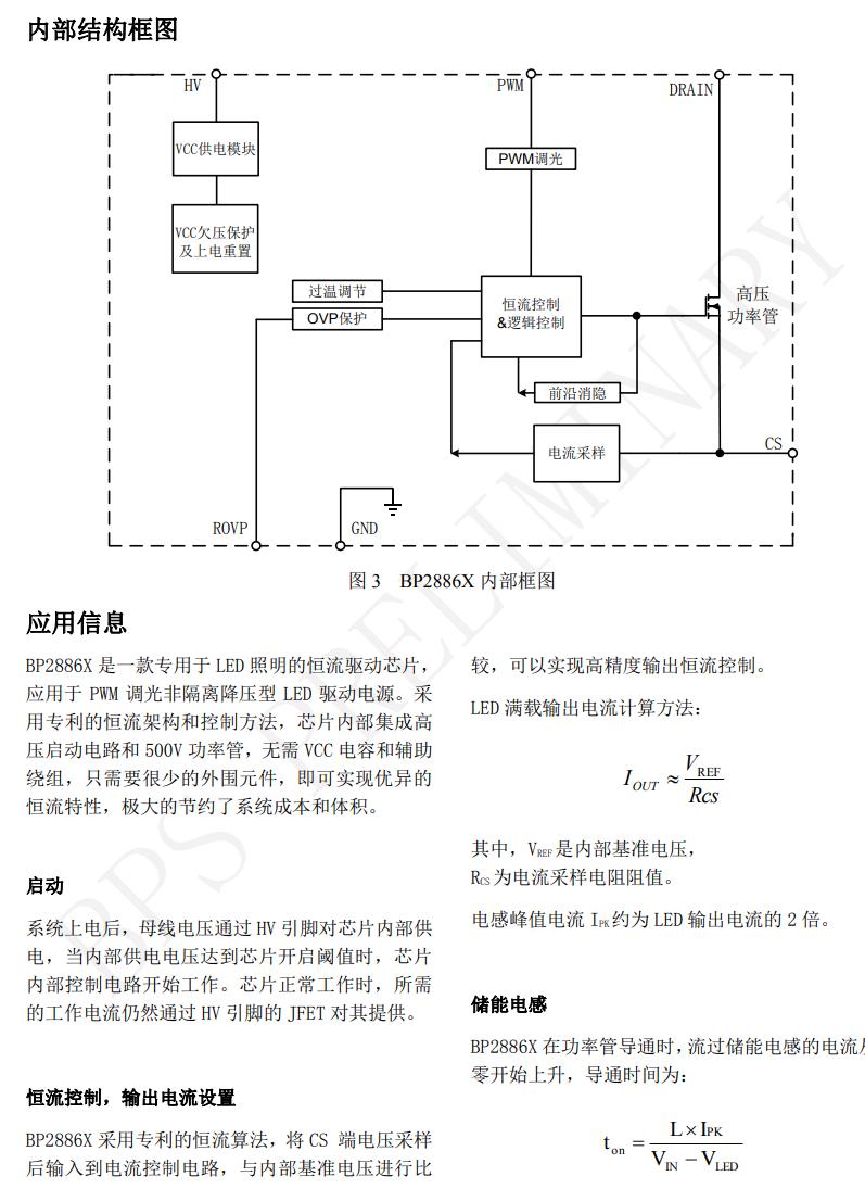 BP2886X 能夠達到優異的調光線性度和輸出電流 一致性,適用于 85Vac~265Vac 全范圍輸入電壓的 非隔離降壓型 LED 恒流電源。 BP2886X 芯片集成高壓啟動電路和 500V 功率管, 無需 VCC 電容和輔助繞組,只需要很少的外圍元 件,即可實現優異的恒流特性,極大的節約了系 統成本和體積。 BP2886X 芯片內部帶有高精度的電流采樣電路,來 實現精確的 LED 恒流輸出和優異的線電壓調整率。