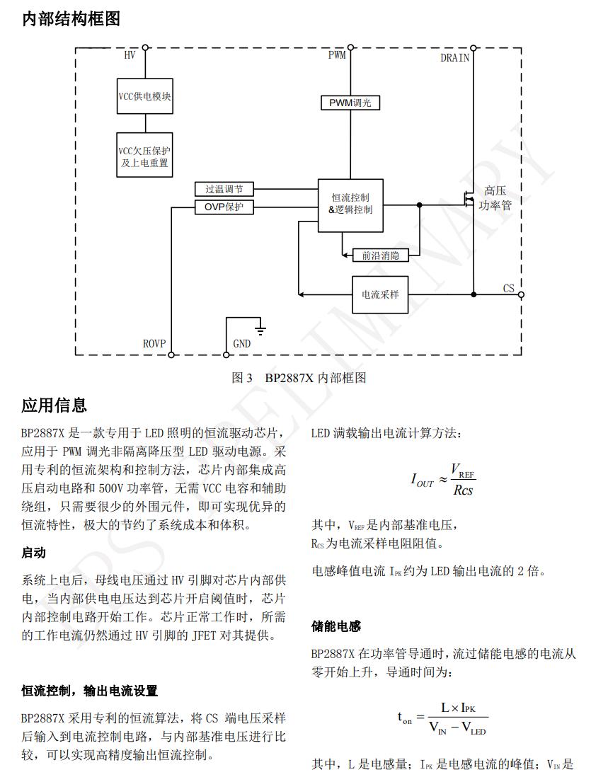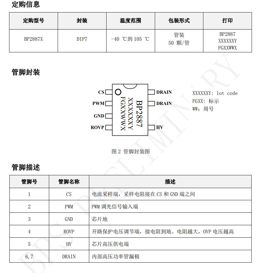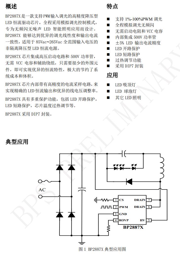 BP2887X 芯片內部帶有高精度的電流采樣電路,來 實現精確的 LED 恒流輸出和優異的線電壓調整率。 BP2887X 具有多重保護功能,包括 LED 開路保護, LED 短路保護,芯片溫度過熱調節等。