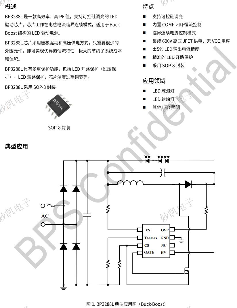 BP3288L是一款高效率、高 PF值,支持可控硅調光的LED驅動芯片。芯片工作在電感電流臨界連續模式,適用于 Buck-Boost 結構的 LED 驅動電源。