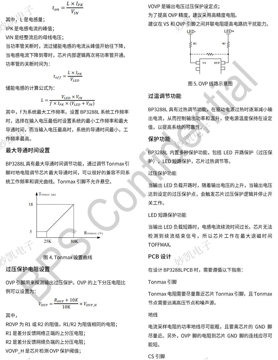 BP3288L芯片采用柵極驅動和高壓供電方式,只需要很少的外圍元件,即可實現優異的恒流特性,極大的節約了系統成本和體積。 BP3288L具有多重保護功能,包括LED開路保護(過壓保護),LED 短路保護,芯片溫度過熱調節等。