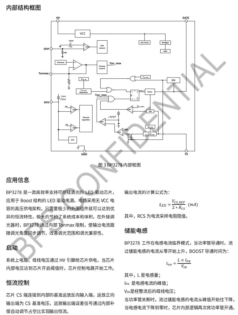 BP3278是一款高效率、高PF值,支持可控硅調光的LED驅動芯片。芯片工作在電感電流臨界連續模式,適用于Boost結構的LED驅動電源。BP3278芯片采用柵極驅動和高壓供電方式,只需要很少的外圍元件,即可實現優異的恒流特性,極大的節約了系統成本和體積。BP3278具有多重保護功能,包括LED開路保護(過壓保護),芯片溫度過熱調節等。BP3278采用SOP-8封裝。