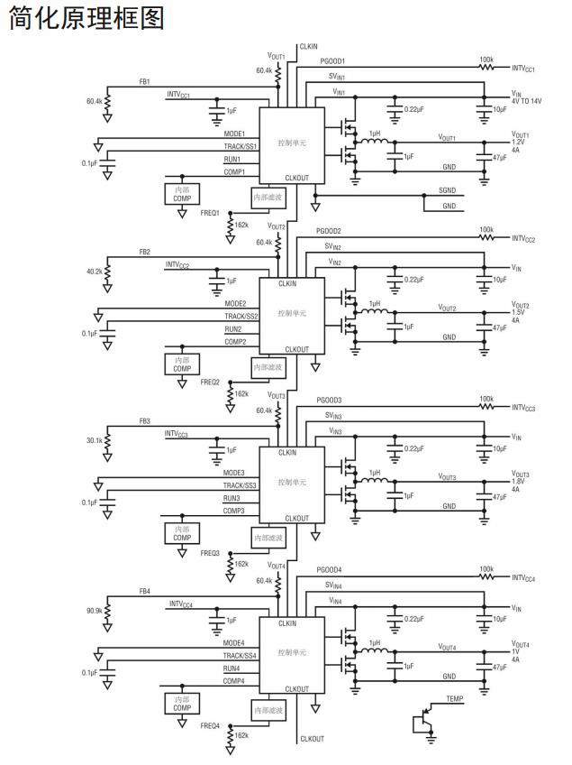 CDM4644是一款獨立四通道4A降壓型DC/DC微模塊電源。可多路輸出或者并聯陣列輸出,最大可輸出16A電流。模塊內置開關控制器、功率FET、電感器、高精度上分壓電阻(0.1%)和配套元件,外部僅需少量濾波/保持電容器及電阻即可構成完整的降壓式四路輸出DC/DC穩壓器。模塊輸入電壓范圍4V~14V,通過一個外置取樣電阻可在0.6V~5.5V范圍設置輸出電壓。模塊支持外部頻率同步、連續/非連續模式和輸出電壓跟蹤排序操作。模塊具有內置溫度監測、過溫、過壓和過流保護功能。