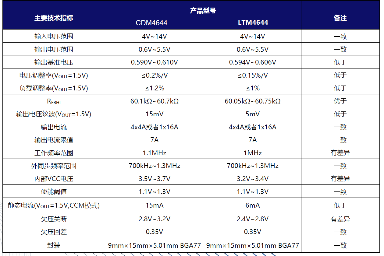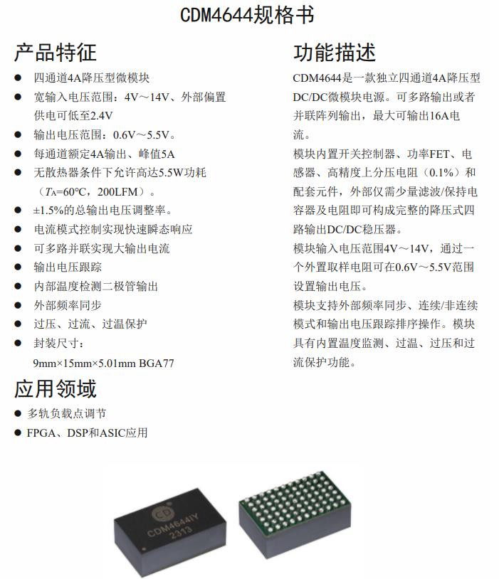 CDM4644 | LTM4644 | DC/DC Micro-module regulator | 4V~14V | 0.6V~5.5V | -40℃~125℃ | BGA-77 |