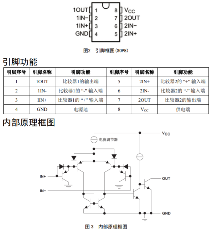 產品特征 ? 單電源或雙電源工作 ? 寬電源電壓范圍: 最大額定值:2V至36V 測試電壓為30V ? 低供電電流:0.5mA(典型值) ? 低輸入偏置電流:25nA(典型值) ? 低輸入失調電流:3nA(典型值) ? 低輸入失調電壓:2mV(典型值) ? 共模輸入電壓范圍包括接地 ? 差分輸入電壓范圍等于最大額定電源電 壓:±36V ? 低輸出飽和電壓 ? 輸出與TTL、MOS和CMOS兼容 ? 封裝形式:SOP8