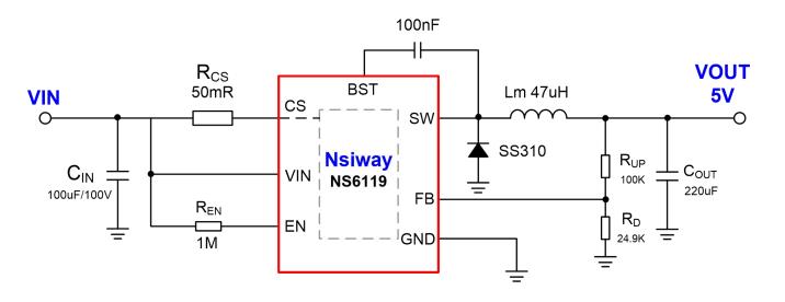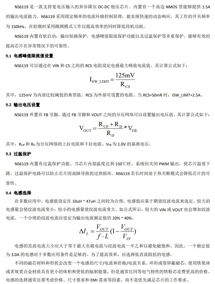 NS6119 是一款支持寬電壓輸入的異步降壓 DC-DC 穩壓芯片。內置有一個高邊 NMOS 管能夠提 供 1.5A 的輸出電流能力。NS6119 采用電流模式的環 路控制原理,實現了快速的動態響應。芯片還集成 有過溫保護,輸出短路保護和輸入欠壓保護等多重 保護功能。
