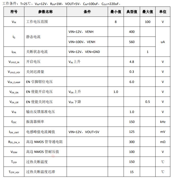 特性 ? 寬輸入電壓范圍:8V-100V ? 最大 1.5A 輸出電流 ? 電感最大峰值電流可調節 ? 低待機功耗 ? 外置 FB 引腳,輸出電壓可調節 ? 支持 EN 使能控制 ? 異步降壓開關頻率 150KHz ? 內置軟啟動 ? 內置過溫保護、輸出短路保護 ? 封裝形式 ESOP8