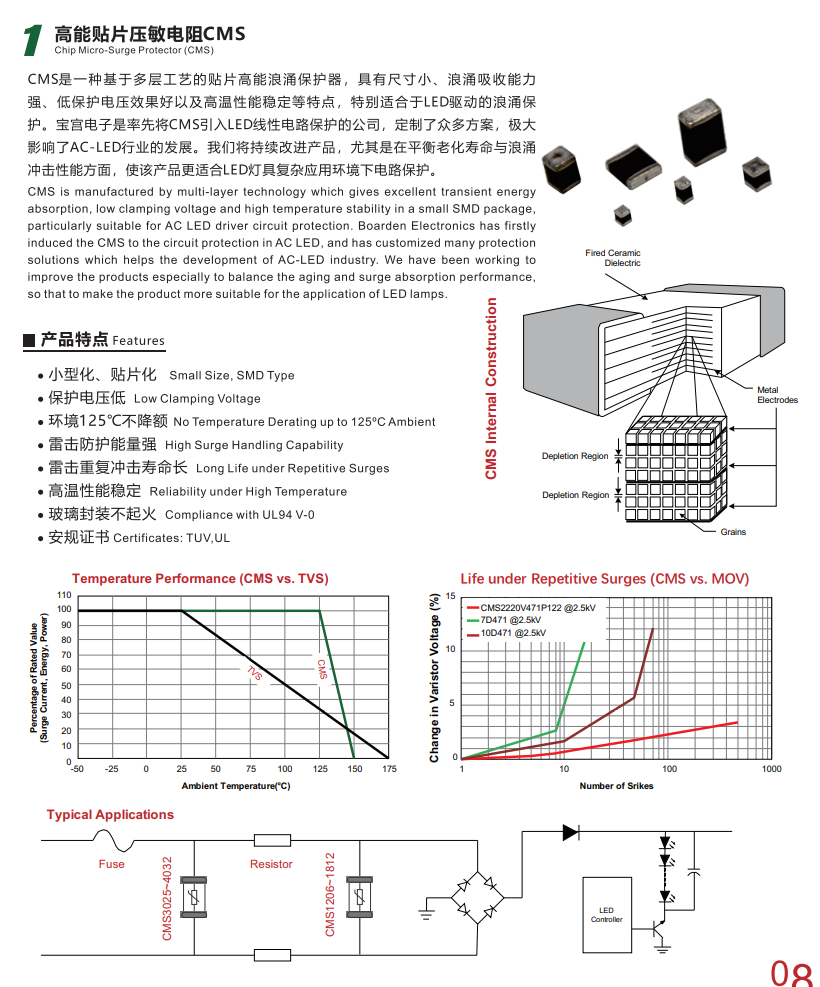 CMS-P系列專為交流電源線保護(hù)應(yīng)用而設(shè)計。它的特點是電流非常大具有非常小的尺寸的保護(hù)能力,也具有非常快的響應(yīng),因此具有超低的箝位電壓。這些特性使CMS-P系列器件成為TVS的最佳替代品和金屬氧化物(MOV)的改進(jìn)
