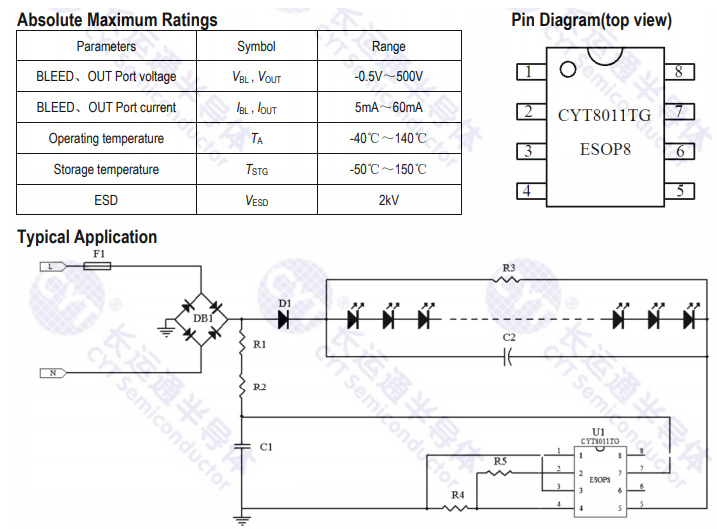 CYT8011TG is a compatible SCR dimming linear constant current IC with adjustable output current, high constant-current accuraCy, simple application scheme, and it does not need too many components. The on-board IC driver is easy to assemble, reduces the material cost and improves the production efficiency. It has over-temperature protection function, safer and more reliable.