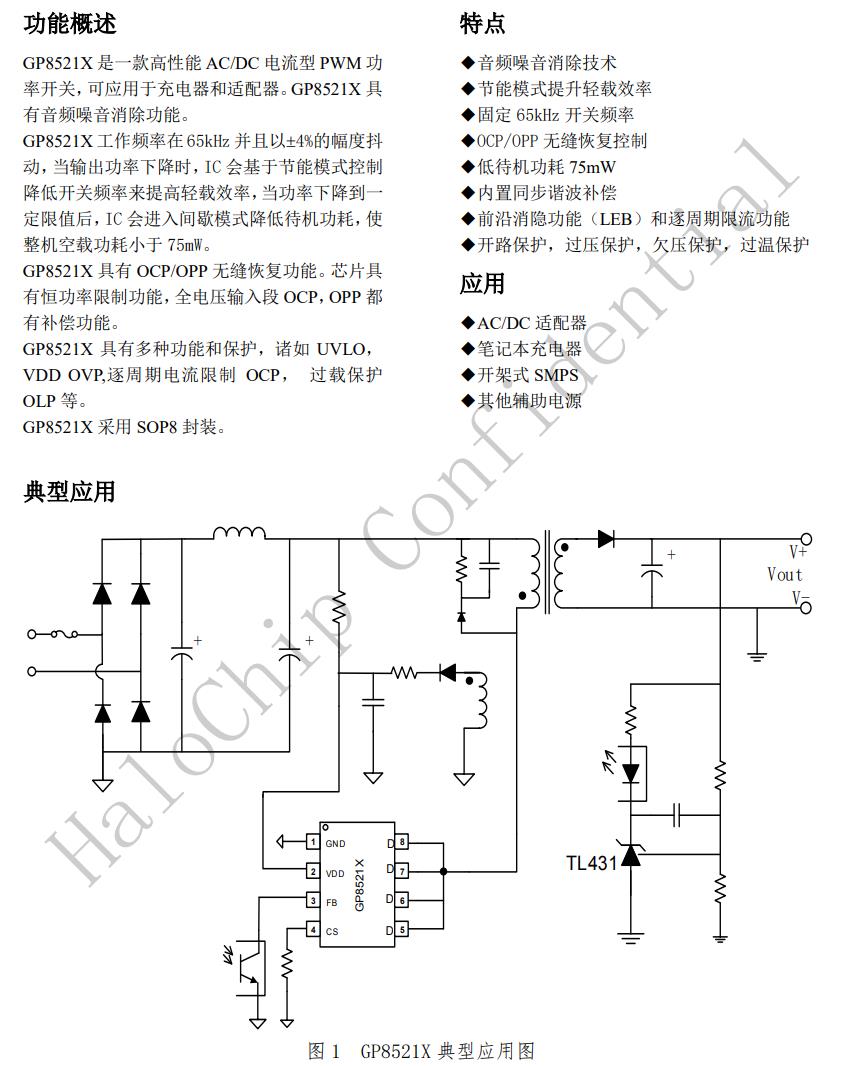 音頻噪音消除技術節能模式提升輕載效率固定65kHz開關頻率OCP/OPP無縫恢復控制低待機功耗75mW內置同步諧波補償前沿消隱功能(LEB)和逐周期限流功能開路保護,過壓保護,欠壓保護,過溫保護