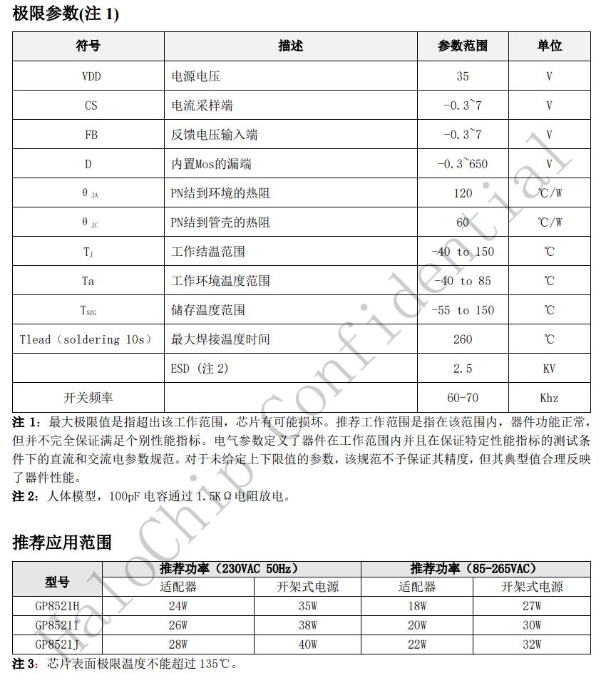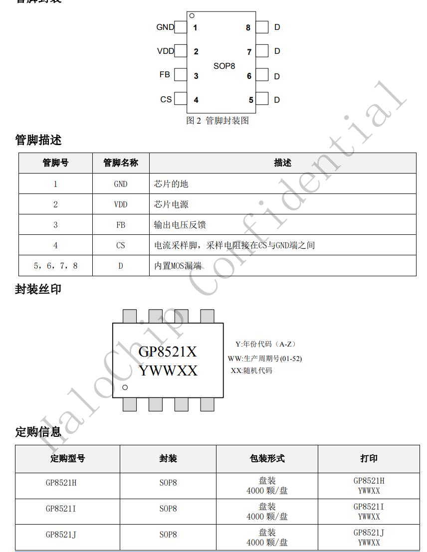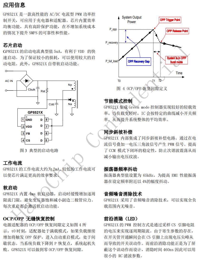 GP8521X是一款高性能AC/DC電流型PWM功率開關,可應用于充電器和適配器。GP8521X具有音頻噪音消除功能。GP8521X工作頻率在65kHz并且以±4%的幅度抖動,當輸出功率下降時,IC會基于節能模式控制降低開關頻率來提高輕載效率,當功率下降到一定限值后,IC會進入間歇模式降低待機功耗,使整機空載功耗小于75mW。GP8521X具有OCP/OPP無縫恢復功能。芯片具有恒功率限制功能,全電壓輸入段OCP,OPP都有補償功能。GP8521X具有多種功能和保護,諸如UVLO,VDDOVP,逐周期電流限制OCP,過載保護OLP等。GP8521X采用SOP8封裝。