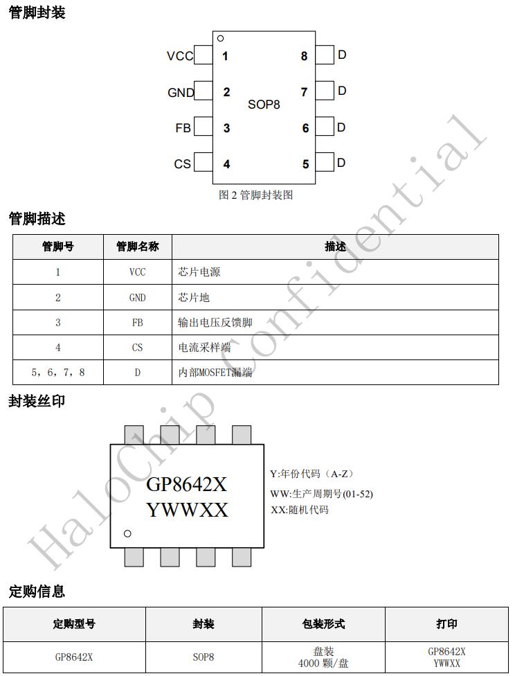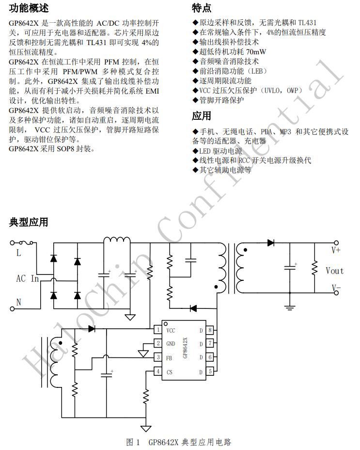 GP8642X是一款高性能的AC/DC功率控制開關,可應用于充電器和適配器。芯片采用原邊反饋和控制無需光耦和TL431即可實現4%的恒壓恒流精度。