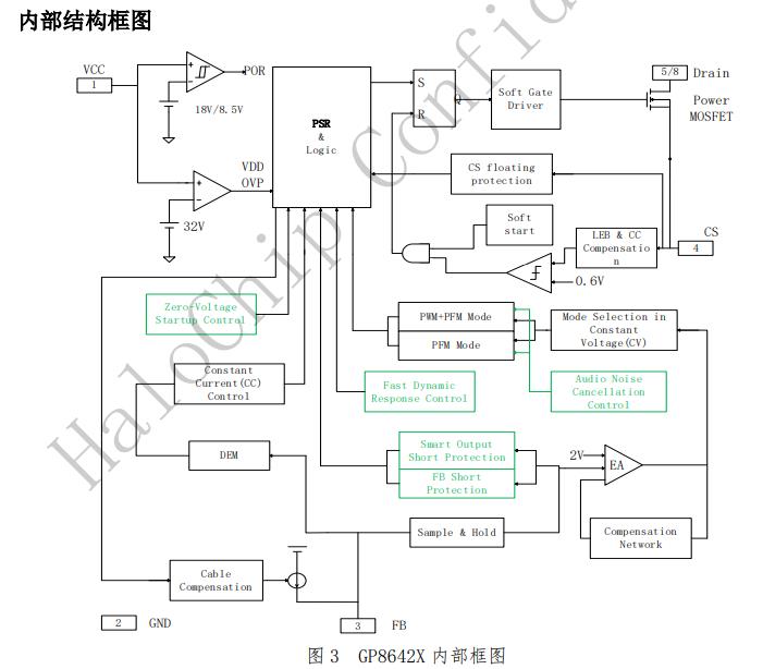 GP8642X提供軟啟動,音頻噪音消除技術以及多種保護功能,諸如自動重啟,逐周期電流限制,VCC過壓欠壓保護,管腳開路短路保護,驅動鉗位保護等。