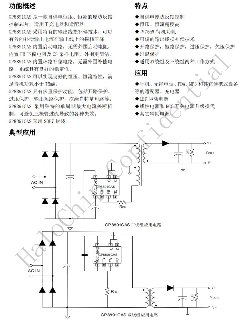 自供電原邊反饋控制恒壓、恒流精度高≦75mW待機功耗可調的輸出線損補償技術開路保護,短路保護,過壓保護,欠壓保護過溫保護適用雙繞組及三繞組兩種工作方式