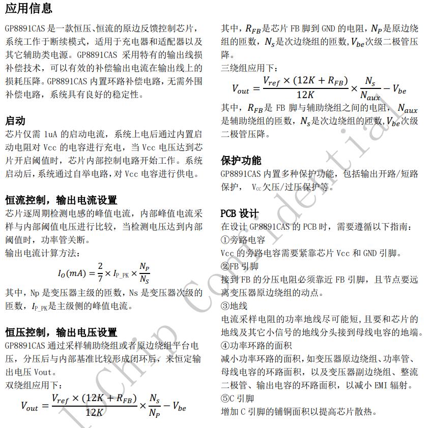 GP8891CAS可以實現良好的恒壓、恒流特性,滿足待機功耗小于75mW。GP8891CAS具有多重保護功能,包括開路保護,過壓保護,輸出短路保護,次級肖特基短路等。
