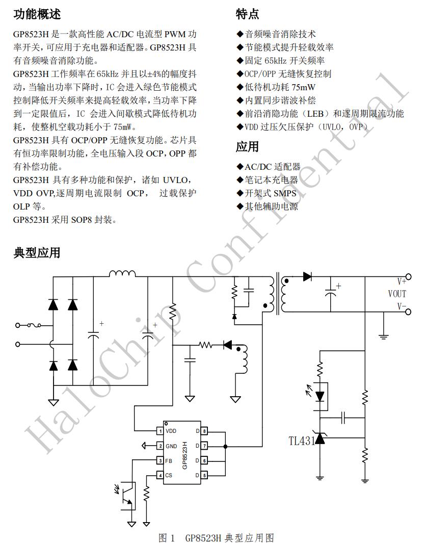 GP8523H是一款高性能AC/DC電流型PWM功率開關,可應用于充電器和適配器。GP8523H具有音頻噪音消除功能。GP8523H工作頻率在65kHz并且以±4%的幅度抖動,當輸出功率下降時,IC會進入綠色節能模式控制降低開關頻率來提高輕載效率,當功率下降到一定限值后,IC會進入間歇模式降低待機功耗,使整機空載功耗小于75mW。