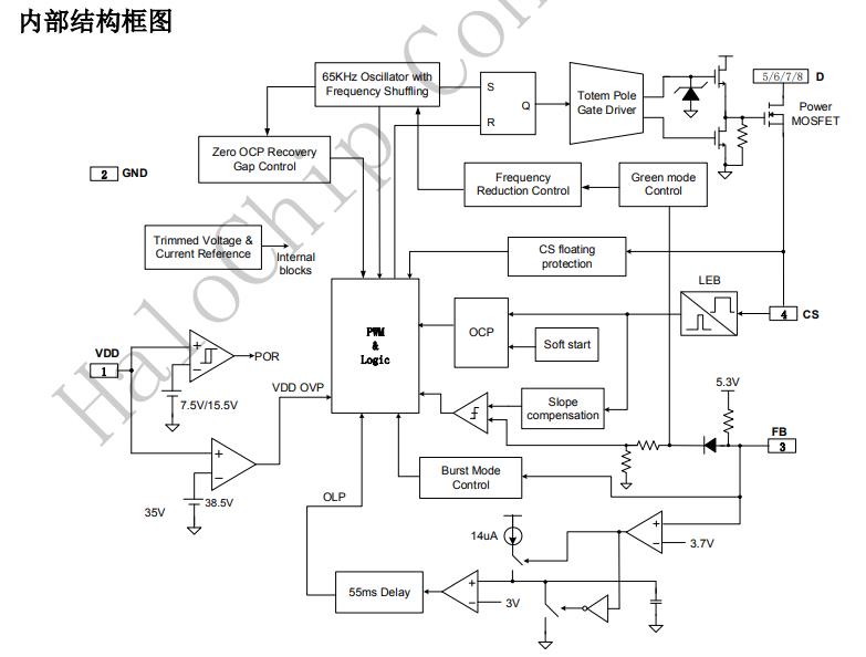 音頻噪音消除技術節能模式提升輕載效率固定65kHz開關頻率OCP/OPP無縫恢復控制低待機功耗75mW內置同步諧波補償前沿消隱功能(LEB)和逐周期限流功能VDD過壓欠壓保護(UVLO,OVP