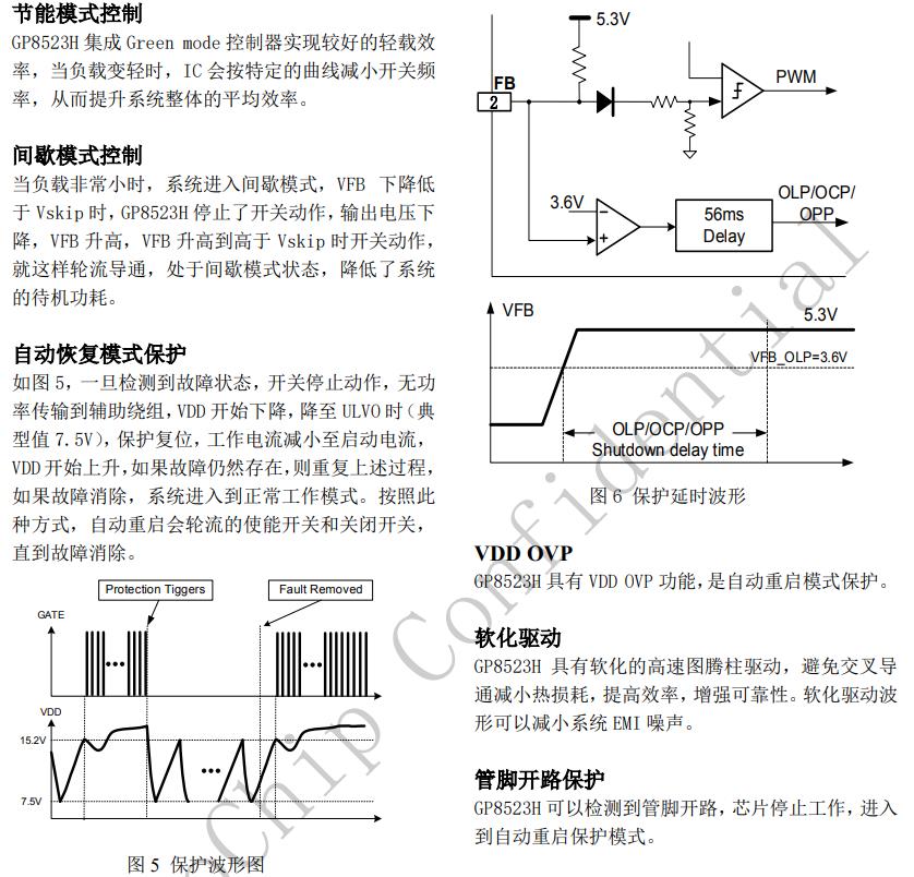 GP8523H具有多種功能和保護,諸如UVLO,VDDOVP,逐周期電流限制OCP,過載保護OLP等。