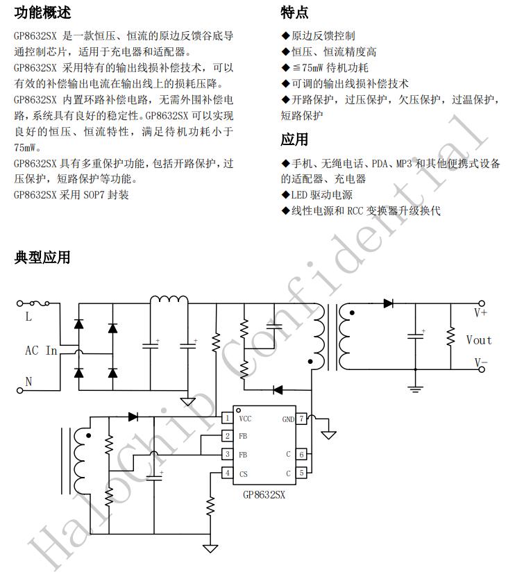 原邊反饋控制恒壓、恒流精度高≦75mW待機(jī)功耗可調(diào)的輸出線損補(bǔ)償技術(shù)開(kāi)路保護(hù),過(guò)壓保護(hù),欠壓保護(hù),過(guò)溫保護(hù),短路保護(hù)