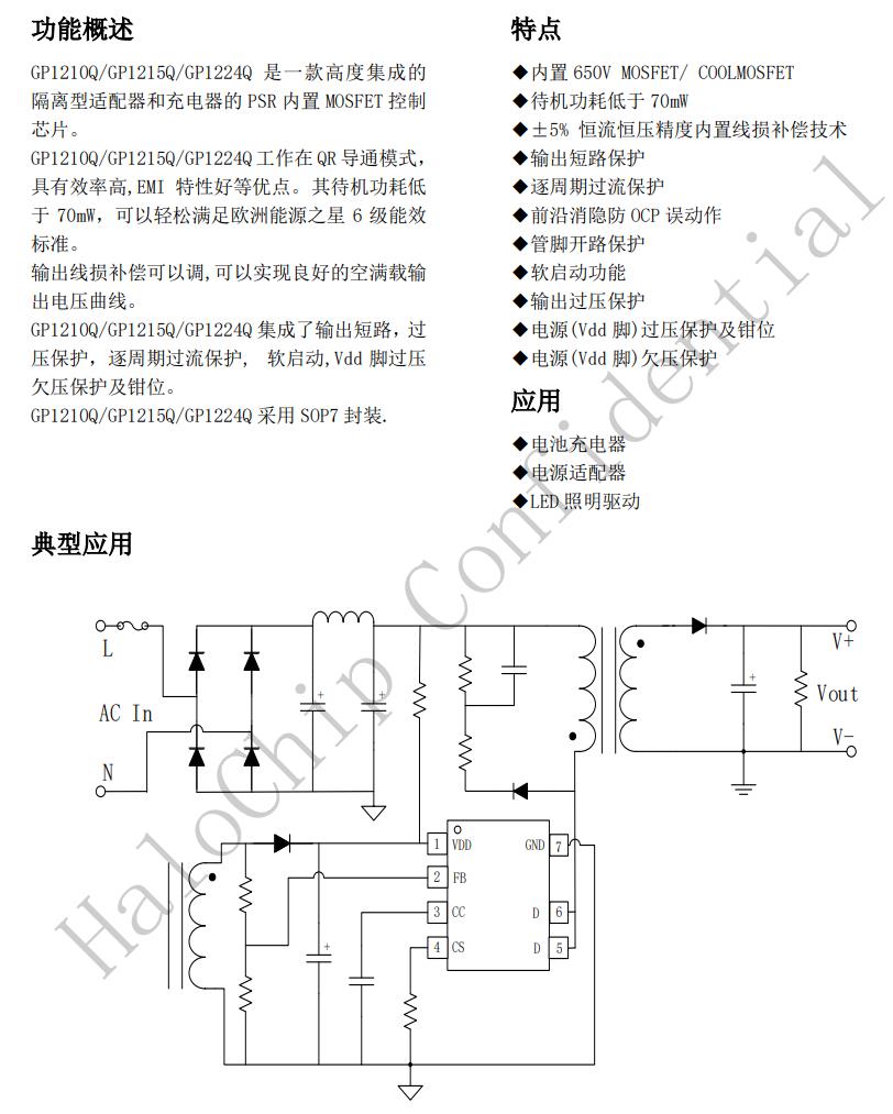 GP1210Q/GP1215Q/GP1224Q是一款高度集成的隔離型適配器和充電器的PSR內置MOSFET控制芯片。