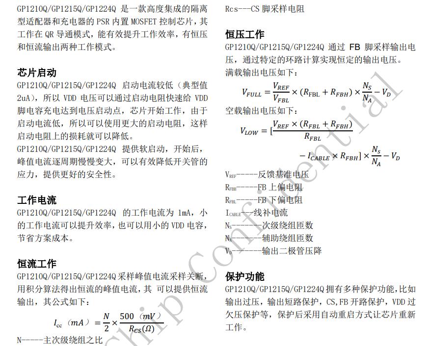 GP1210Q/GP1215Q/GP1224Q集成了輸出短路,過壓保護,逐周期過流保護,軟啟動,Vdd腳過壓欠壓保護及鉗位。