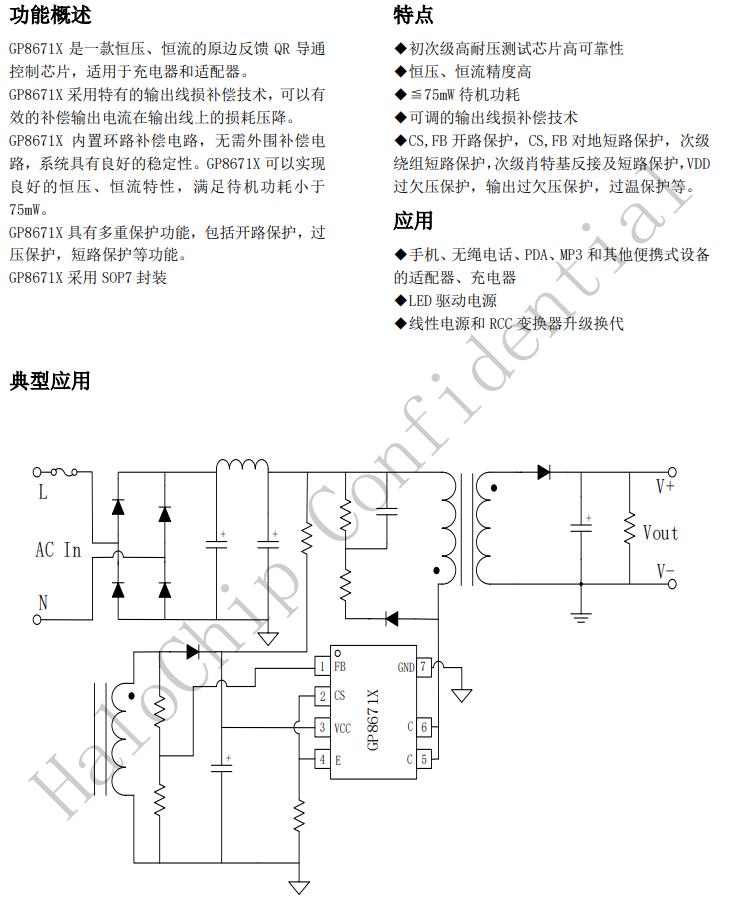 GP8671X是一款恒壓、恒流的原邊反饋QR導通控制芯片,適用于充電器和適配器。GP8671X采用特有的輸出線損補償技術,可以有效的補償輸出電流在輸出線上的損耗壓降。