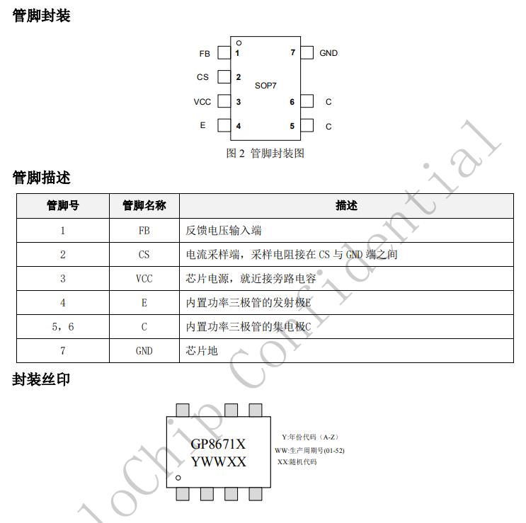 GP8671X具有多重保護功能,包括開路保護,過壓保護,短路保護等功能。GP8671X采用SOP7封裝
