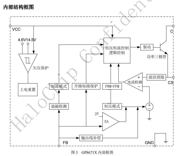 GP8671X內置環路補償電路,無需外圍補償電路,系統具有良好的穩定性。GP8671X可以實現良好的恒壓、恒流特性,滿足待機功耗小于75mW。