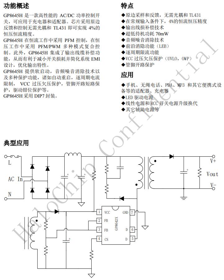 GP8645H是一款高性能的AC/DC功率控制開關(guān),可應用于充電器和適配器。芯片采用原邊反饋和控制無需光耦和TL431即可實現(xiàn)4%的恒壓恒流精度。