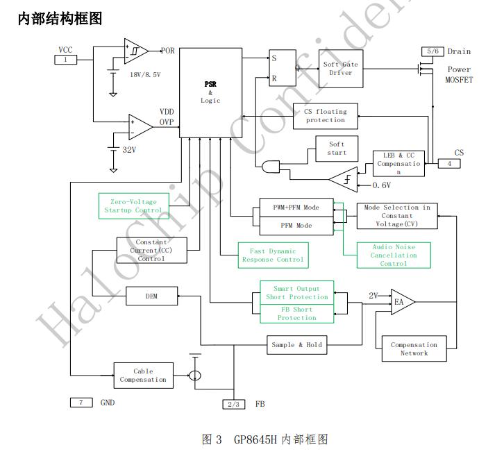 GP8645H提供軟啟動,音頻噪音消除技術(shù)以及多種保護功能,諸如自動重啟,逐周期電流限制,VCC過壓欠壓保護,管腳開路短路保護,驅(qū)動鉗位保護等。