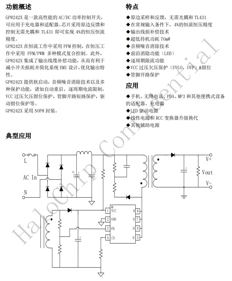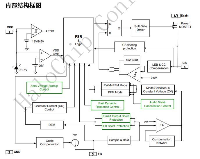 原邊采樣和反饋,無需光耦和TL431在常規(guī)輸入條件下,4%的恒流恒壓精度輸出線損補償技術(shù)超低待機功耗70mW音頻噪音消除技術(shù)前沿消隱功能(LEB)逐周期限流功能VCC過壓欠壓保護(UVLO,OVP)&鉗位管腳開路保護