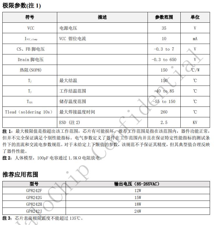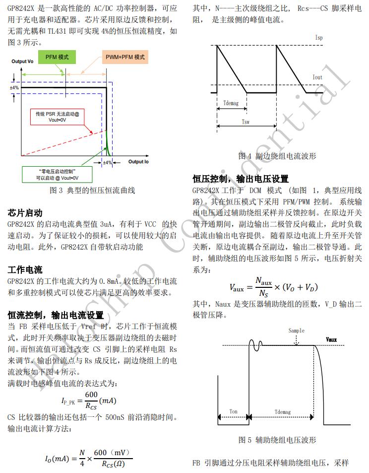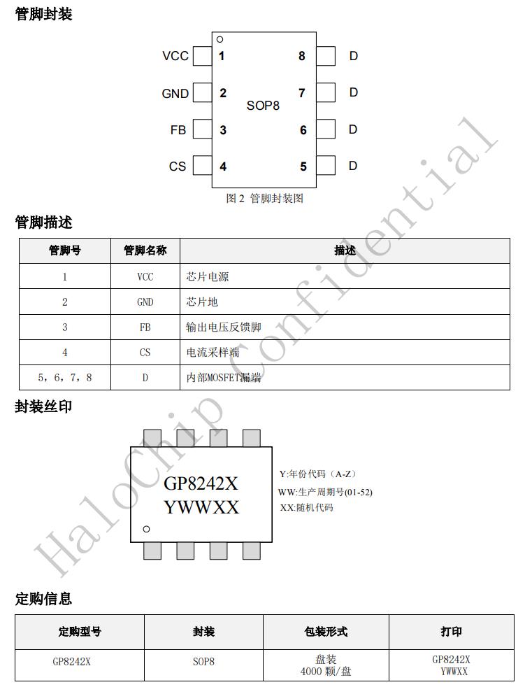 GP8242X是一款高性能的AC/DC功率控制開關(guān),可應(yīng)用于充電器和適配器。芯片采用原邊反饋和控制無需光耦和TL431即可實現(xiàn)4%的恒壓恒流精度。GP8242X在恒流工作中采用PFM控制,在恒壓工作中采用PFM/PWM多種模式復(fù)合控制。此外,GP8242X集成了輸出線纜補償功能,從而有利于減小開關(guān)損耗并簡化系統(tǒng)EMI設(shè)計,優(yōu)化輸出特性。GP8242X提供軟啟動,音頻噪音消除技術(shù)以及多種保護功能,諸如自動重啟,逐周期電流限制,VCC過壓欠壓鉗位保護,管腳開路短路保護,驅(qū)動鉗位保護等。GP8242X采用SOP8封裝。