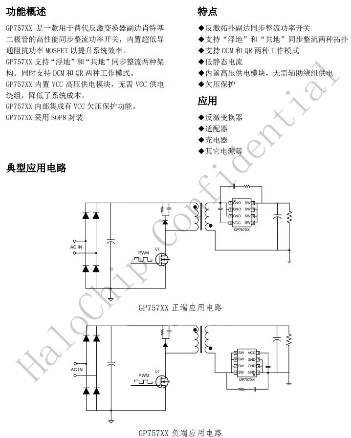GP757XX是一款用于替代反激變換器副邊肖特基二極管的高性能同步整流功率開關,內置超低導通阻抗功率MOSFET以提升系統效率。