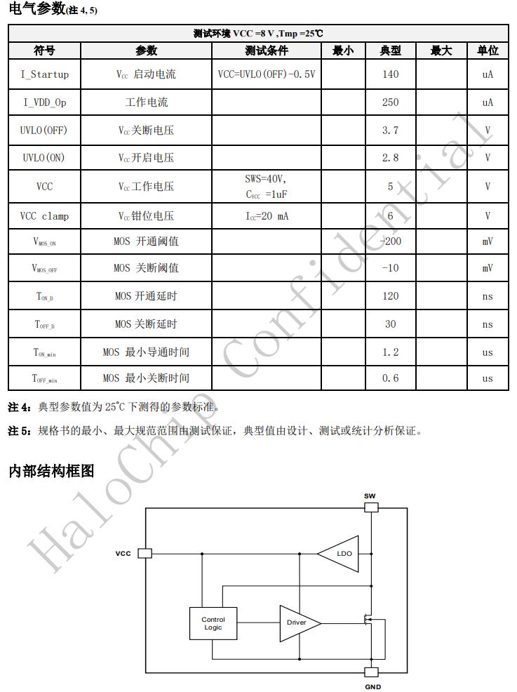 反激拓撲副邊同步整流功率開關支持“浮地”和“共地”同步整流兩種拓撲支持DCM和QR兩種工作模式低靜態電流內置高壓供電模塊,無需輔助繞組供電欠壓保護
