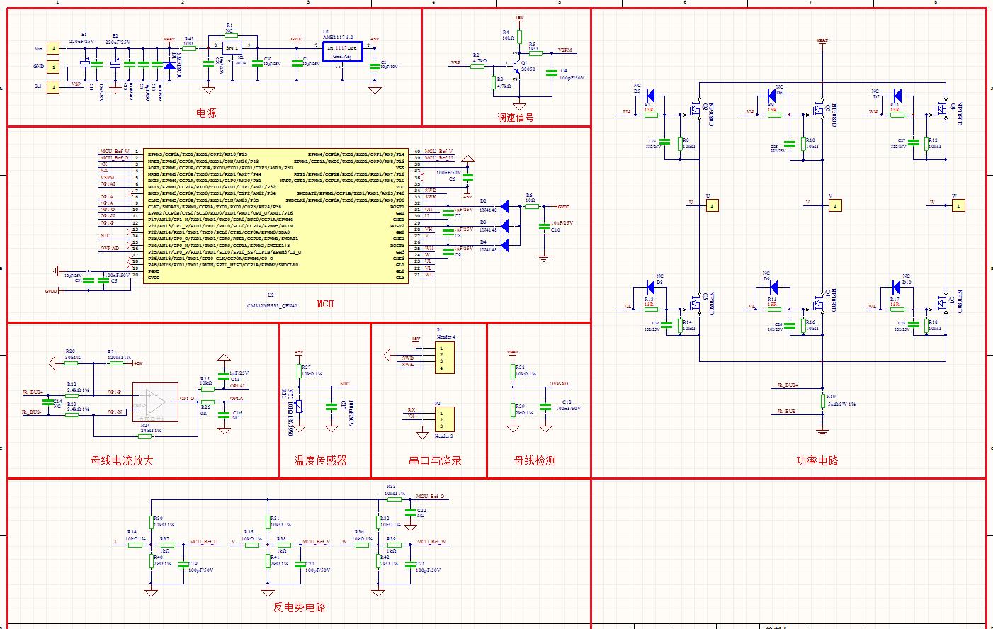 采用 0.005R 采樣電阻取得母線電流對(duì)應(yīng)的電壓信號(hào),通過單片機(jī)內(nèi)置運(yùn)算放大器放大 (放大倍數(shù)為 10 倍)。為了能得到準(zhǔn)確的電流信息,增加偏置電路。偏置電壓由 R21、R22、R19 分壓后通過 CMS32M5533 內(nèi)部運(yùn)算放大器產(chǎn)生。